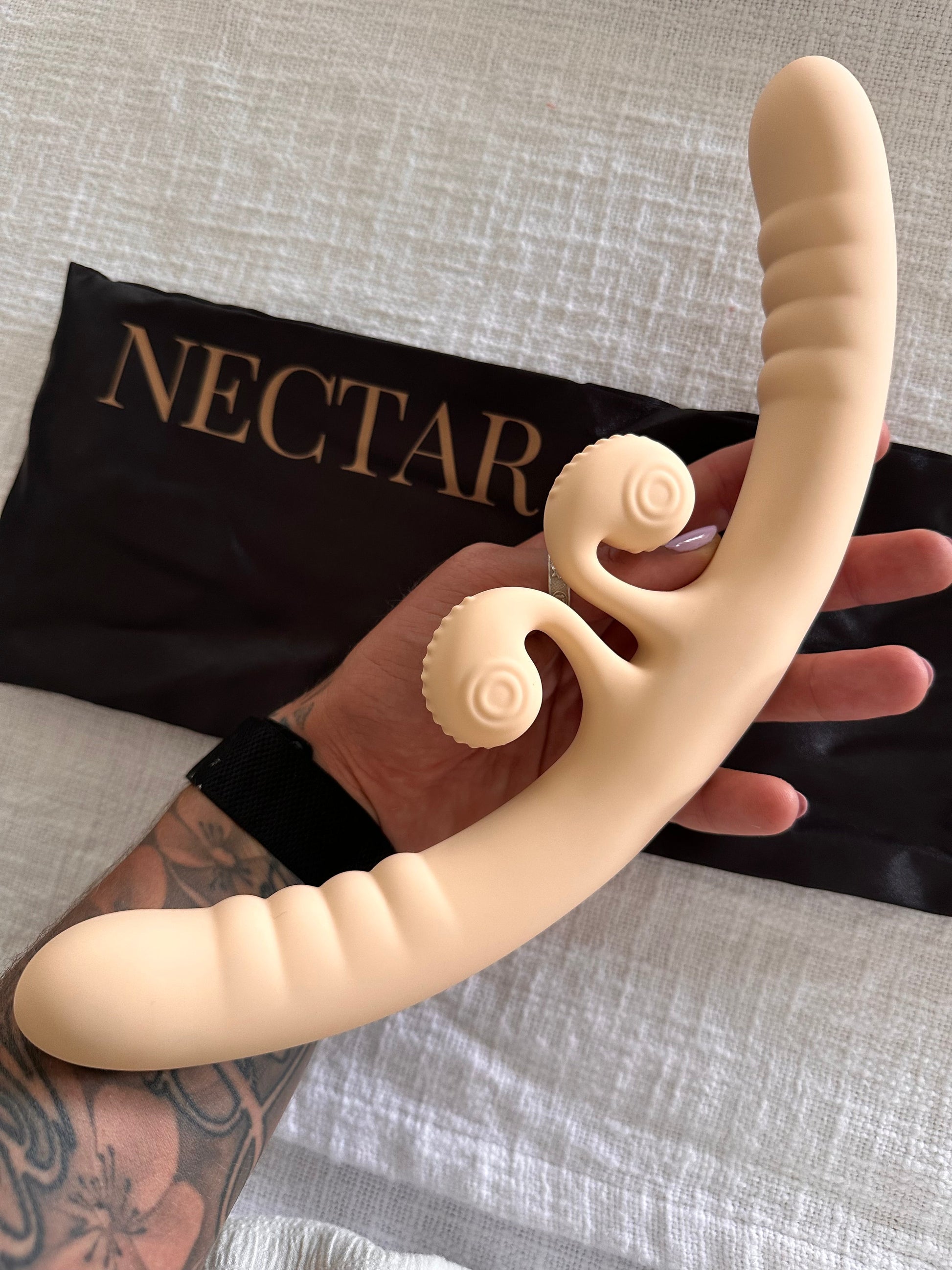 Perfect for partnered penetration, grinding, scissoring, or solo exploration. Each end vibrates with intention, allowing you to co-create rhythm and pressure. Bend it, move it, let it follow your bodies. Compatible with all lubricants.